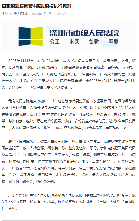 据深圳市中级人民法院微信公众号消息,2025�񀙓日,广东省深圳市中级人民法院以故意杀人、故意伤害、诈骗、贩卖、制造毒品、绑架、开设赌场等罪,判处白家犯罪集团案白所成、白应苍、杨立强、胡小姜、陈广益񍃟人死刑,并判处相应附加刑。一审宣判后,白所成因病死亡,其他被告人提出上诉。广东省高级人民法院经开庭审理,���日裁定驳回上诉,维持原判,并依法报请最高人民法院核准。